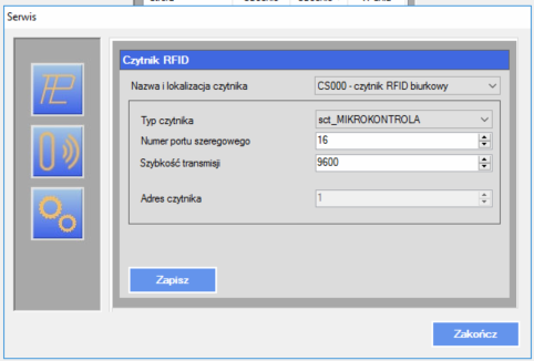7 - druga ikona od góry otwiera formę konfiguracji z czytnikami transponderów lub kodów paskowych. Proszę z listy rozwijanej Nazwa i lokalizacja czytnika wybrać odpowiedni czytnik, co spowoduje wyświetlenie danych połączenia w polu poniżej. Następnie proszę sprawdzić czy wartość w polu Numer portu